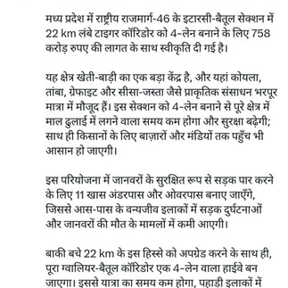 गड़करी ने कहा कि इस 22 किलोमीटर के इस हिस्से को अपग्रेड करने के साथ ही, पूरा ग्वालियर-बैतूल कारिडोर एक फोर लेन वाला हाईवे भी बन जाएगा। इससे यात्रा का समय कम होगा, पहाड़ी इलाकों में सड़क सुरक्षा बेहतर होगी, और माधव नेशनल पार्क, रातापानी और सतपुड़ा टाइगर रिजर्व में इको-पर्यटन को बढ़ावा मिलेगा।
